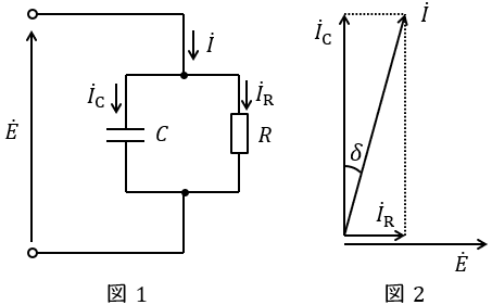 絶縁物に交流電圧を印加すると,劣化がなければほぼ\( \ \displaystyle \frac {\pi }{2} \ \mathrm {[rad]} \ \)だけ進んだ電流となりますが,絶縁劣化してくると抵抗分が増えます。すなわち等価回路で描くと図1のようになり,そのベクトル図は図2のようになります。この\( \ \displaystyle \frac {I_{\mathrm {R}}}{I_{\mathrm {C}}} \ \)の比が誘電正接\( \ \tan \delta \ \)と呼ばれ,絶縁劣化すると誘電正接の値が上昇していきます。
