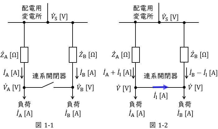 であり,\( \ {\dot V}_{\mathrm {A}}≠{\dot V}_{\mathrm {B}} \ \)のとき,連系開閉器を投入すると電圧\( \ {\dot V}_{\mathrm {A}} \ \)と\( \ {\dot V}_{\mathrm {B}} \ \)が等しくなるようにループ電流が流れます。
