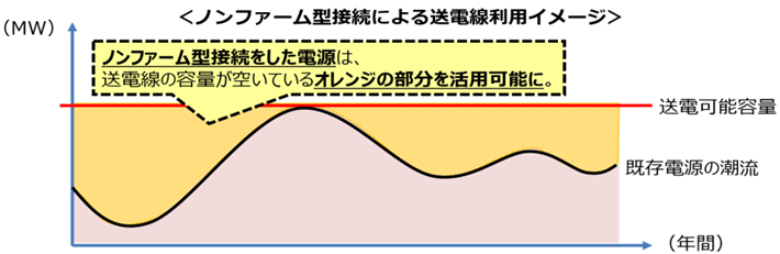 ワンポイント解説「1.日本版コネクト&マネージ」の通り,ノンファーム型接続はあらかじめ容量を確保せずに,空き容量があるときにそれを活用して電源を接続する方法です。