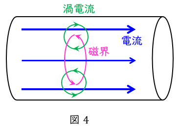 交流電流において,導体内を流れる電流によりアンペールの法則に沿った磁界が発生し,その発生した磁界の変化によりファラデーの電磁誘導の法則に沿った渦電流が発生することで,導体内の電流分布が外側に集中する現象です。