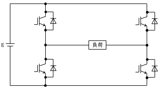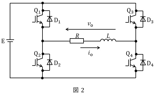 パワーエレクトロニクス回路において,インバータは直流を交流に変換する回路である。図は,スイッチングデバイスとして\( \ \mathrm {IGBT} \ \)を用いた場合の直流電源を\( \ \mathrm {E} \ \)とする単相電圧形インバータの回路図を示している。電圧形インバータの出力電圧は方形波であるが,\( \ \fbox { (1) } \ \)負荷の場合には,出力電流は連続した波形となる。この負荷の場合では,負荷に流れる電流経路を確保するために四つの\( \ \mathrm {IGBT} \ \)には逆並列にダイオードがそれぞれ接続される。また,同時に\( \ \mathrm {ON} \ \)できる\( \ \mathrm {IGBT} \ \)の数は\( \ \fbox { (2) } \ \)である。現在では,電圧形インバータに使用されるスイッチングデバイスとして\( \ \mathrm {IGBT} \ \)の他には\( \ \fbox { (3) } \ \)が広く使用されている。