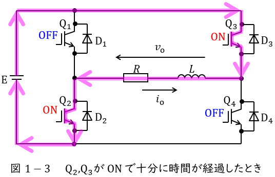 リアクトル\( \ L \ \)のエネルギーがなくなり,図1-3に示すように\( \ \mathrm {E} \ \)→\( \ \mathrm {Q_{3}} \ \)→\( \ L \ \)→\( \ R \ \)→\( \ \mathrm {Q_{2}} \ \)→\( \ \mathrm {E} \ \)と導通します。