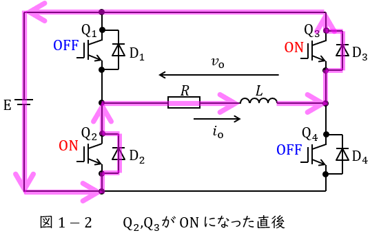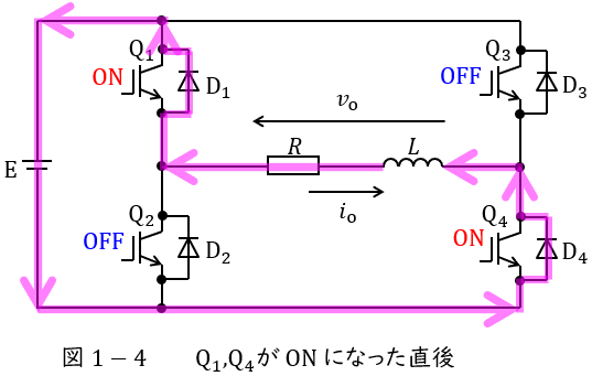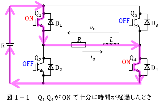 図1-1に示すように\( \ \mathrm {E} \ \)→\( \ \mathrm {Q_{1}} \ \)→\( \ R \ \)→\( \ L \ \)→\( \ \mathrm {Q_{4}} \ \)→\( \ \mathrm {E} \ \)と導通します。
