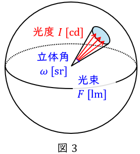 ある方向に向かう光束\( \ F \ \mathrm {[lm]} \ \)を立体角\( \ \omega \ \mathrm {[sr]} \ \)で割ったもので,光度\( \ I \ \mathrm {[cd]} \ \)を式で表すと,