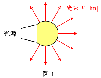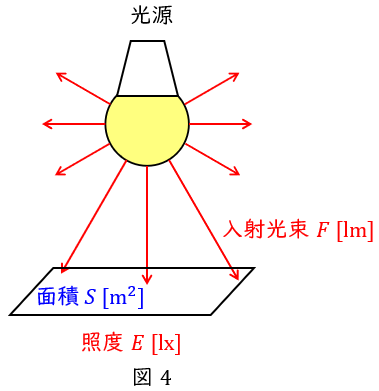単位面積あたりの光束で単位は\( \ \mathrm {[lx]} \ \)で,図4のように光源から面積\( \ S \ \mathrm {[m^{2}]} \ \)の面に入射する光束が\( \ F \ \mathrm {[lm]} \ \)であるとき,平均照度\( \ E \ \mathrm {[lx]} \ \)は,