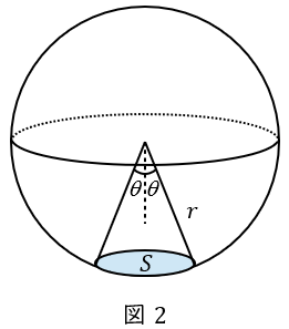 図2のように球体があり,半径\( \ r \ \mathrm {[m]} \ \)の錐体が球面を切り取った時の面積を\( \ S \ \mathrm {[m^{2}]} \ \)とすると,立体角\( \ \omega \ \mathrm {[sr]} \ \)は,