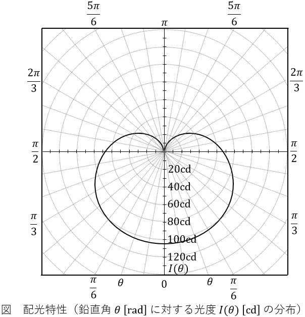 \( \ \mathrm {LED} \ \)ランプの仕様や配光に関する問題です。