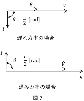 同期調相機は無負荷の同期電動機なので,運転時のフェーザ図は図7に示すようになる。したがって,同期調相機の負荷角\( \ \delta =0 \ \mathrm {[rad]} \ \)であり,\( \ \cos \delta =1 \ \)となるので,これと\( \ V=1.0 \ \mathrm {[p.u.]} \ \)を(4)解答式に代入すると,