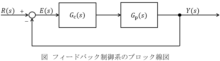 図はフィードバック制御系の基本構成を示し,\( \ G_{\mathrm {c}} (s) \ \)は補償器の伝達関数,\( \ G_{\mathrm {p}} (s) \ \)は制御対象の伝達関数を表わしている。また,\( \ R (s) \ \),\( \ E (s) \ \),\( \ Y (s) \ \)は,目標信号\( \ r (t) \ \),偏差信号\( \ e (t) \ \),制御量\( \ y (t) \ \)をそれぞれラプラス変換したものである。