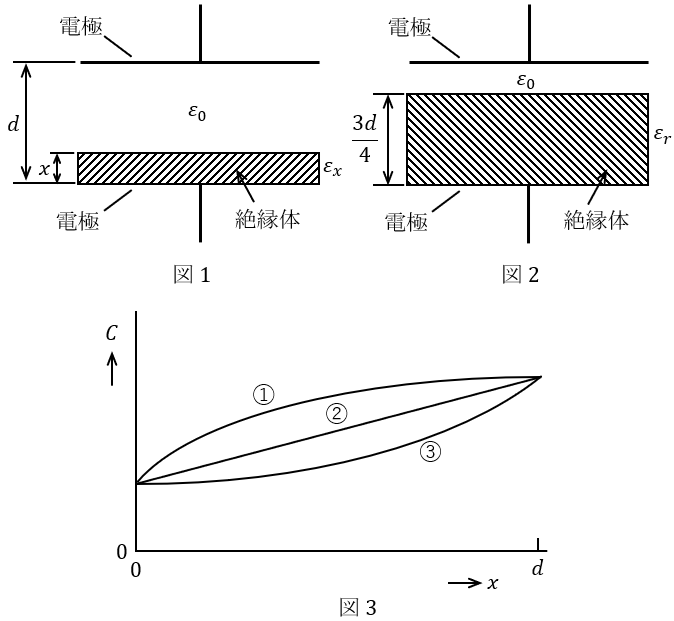 このコンデンサの静電容量\( \ C \ \)を絶縁物の厚さ\( \ x \ \)の関数として表せば,\( \ \fbox {  (3)  } \ \)となる。この関数をグラフに描くとその概略は図3の\( \ \fbox {  (4)  } \ \)のようになる。