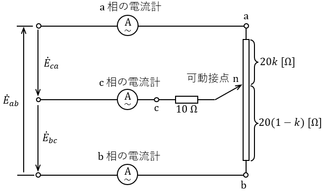 対称三相電圧\( \ {\dot E}_{ab}=200∠0^{\circ } \ \mathrm {[V]} \ \),\( \ {\dot E}_{bc}=200∠-120^{\circ } \ \mathrm {[V]} \ \),\( \ {\dot E}_{ca}=200∠-240^{\circ } \ \mathrm {[V]} \ \)が,図のような負荷の端子\( \ \mathrm {a} \ \),\( \ \mathrm {b} \ \),\( \ \mathrm {c} \ \)に印加されている。負荷端子の\( \ \mathrm {a-b} \ \)間には抵抗値が\( \ 20 \ \mathrm {[\Omega ]} \ \)で可動接点\( \ \mathrm {n} \ \)をもつ抵抗が接続されており,その接点\( \ \mathrm {n} \ \)と負荷端子\( \ \mathrm {c} \ \)の間には抵抗値が\( \ 10 \ \mathrm {[\Omega ]} \ \)の固定抵抗が接続されている。ただし,\( \ \mathrm {a-n} \ \)間の抵抗は長さに比例しているものとする。いま,分割の係数を\( \ k \left( 0≦k≦1\right) \ \)とすると,\( \ \mathrm {a-n} \ \)間の抵抗値は\( \ 20k \ \mathrm {[\Omega ]} \ \),\( \ \mathrm {b-n} \ \)間の抵抗値は\( \ 20\left( 1-k\right) \ \mathrm {[\Omega ]} \ \)となる。