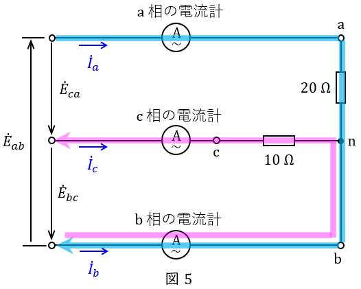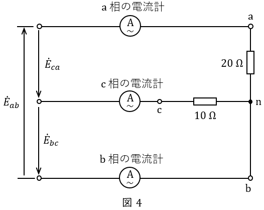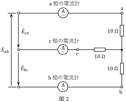 であり,図5に示す二つの閉回路を用いて各電流値を表すと,ベクトルオペレータを用いて\( \ {\dot E}_{ab}=200 \ \mathrm {[V]} \ \),\( \ {\dot E}_{bc}=200a^{2} \ \mathrm {[V]} \ \),\( \ {\dot E}_{ca}=200a \ \mathrm {[V]} \ \)であることに注意すれば,