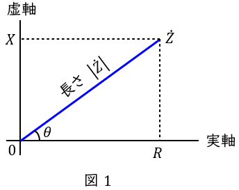 ただし,\( \ \dot Z \ \)の絶対値\( \ \left| \dot Z\right| = \sqrt {R^{2}+X^{2}} \ \),\( \ \dot Z \ \)と実軸となす角を\( \ \theta \ \)とします。