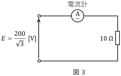 となるので,回路図は図2のようになり,三相平衡回路であるから,一相分等価回路は図3のようになる。よって,電流計の指示値\( \ I_{1} \ \mathrm {[A]} \ \)は,
