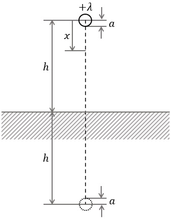 図に示すように,大地面から高さ\( \ h \ \)の位置に大地面と平行に張られた直線状の電線を考える。電線は無限長であり,半径\( \ a \ \)は\( \ h \ \)よりも十分小さい\( \ \left( a≪h \right) \ \)。影像法を用いる場合,大地面から深さ\( \ h \ \)の位置に半径\( \ a \ \)で無限長の影像電線を考え,電線に単位長さ当たり\( \ +\lambda \ \)の電荷を与えると,影像電線の単位長さ当たりの電荷は\( \ \fbox { (1) } \ \)となる。このとき,電線から大地に向かう垂線上で電線の中心軸から距離\( \ x\left( ≧a \right) \ \)の位置に電線の電荷\( \ +\lambda \ \)がつくる電界の強さは \( \ E_{1}\left( x\right)= \ \fbox { (2) } \ \),影像電線の電荷がつくる電界の強さは\( \ E_{2}\left( x\right) = \ \fbox { (3) } \ \)となり,電線の中心軸から距離\( \ x \ \)の位置の電界の強さは\( \ E\left( x\right) =E_{1}\left( x\right) +E_{2}\left( x\right) \ \)と求まる。