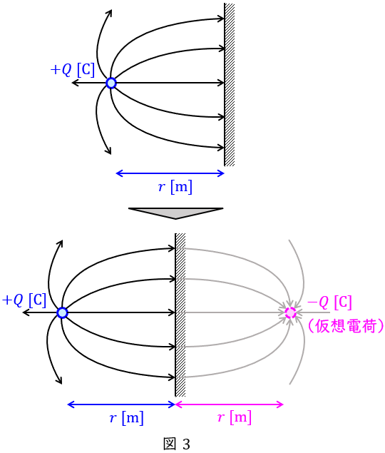 図3のような平面導体から距離\( \ r \ \mathrm {[m]} \ \)を隔てて電荷があるとき,電気力線は導体に垂直に入射するため,符号が逆の電荷(仮想電荷)を設定して電界を求めることができます。これを電気影像法といいます。