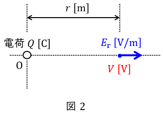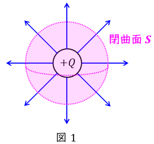 となり,これをガウスの法則といいます。例えば,図1に示すような,点電荷\( \ Q \ \mathrm {[C]} \ \)をおいた場合の距離\( \ r \ \mathrm {[m]} \ \)での電界\( \ E \ \mathrm {[V / m]} \ \)は,