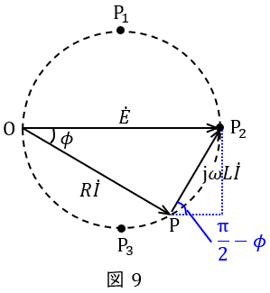 スイッチ\( \ \mathrm {S} \ \)が開のときの回路の電圧ベクトル図を図2に示す。\( \ R \ \)を変化させると電流の変化につれて三角形\( \ \mathrm {OP_{2}P} \ \)も変化するが,\( \ R\dot I \ \)と\( \ {\dot V}_{\mathrm {L}}=\mathrm {j}\omega L\dot I \ \)は直交するので直角の頂点\( \ \mathrm {P} \ \)は\( \ \dot E \ \)を直径とする円周上を移動する。