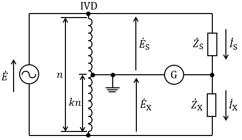 図は,既知の標準インピーダンス\( \ {\dot Z}_{\mathrm {S}} \ \)を用いて未知のインピーダンス\( \ {\dot Z}_{\mathrm {X}} \ \)を校正するためのブリッジ回路で,交流電源\( \ \dot E \ \),誘導分圧器\( \ \mathrm {IVD} \ \)及び検流計Ⓖで構成されている。なお,\( \ \mathrm {IVD} \ \)は理想的なものであり,全体の巻数\( \ n \ \)が固定で,\( \ k \ \)は可変(ただし,\( \ 0 < k < 1 \ \))である。