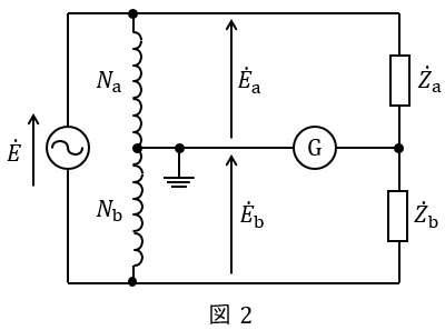 また,図2のように電源の代わりに変成器の巻数比によりインピーダンスを特定するためのブリッジ回路を変成器ブリッジといい,\( \ \displaystyle {\dot E}_{\mathrm {a}}=\frac {N_{\mathrm {a}}}{N_{\mathrm {a}}+N_{\mathrm {b}}}\dot E \ \)及び\( \ \displaystyle {\dot E}_{\mathrm {b}}=\frac {N_{\mathrm {b}}}{N_{\mathrm {a}}+N_{\mathrm {b}}}\dot E \ \)であり,