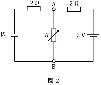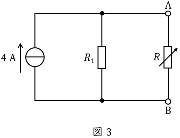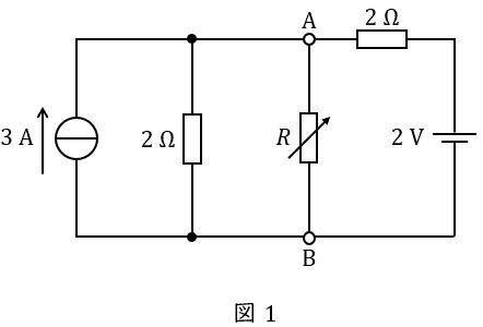 図1の直流回路は,直流電圧源,直流電流源及び抵抗から構成されており,端子\( \ \mathrm {A-B} \ \)間の抵抗\( \ R \ \)は可変抵抗である。以下の手順に従って,可変抵抗\( \ R \ \)で消費される電力が最大となる条件及び最大消費電力を求める。