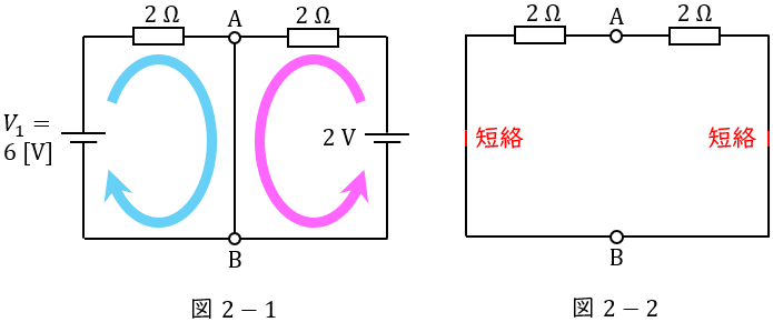 図1の\( \ 3 \ \mathrm {A} \ \)の電流源と\( \ 2 \ \mathrm {\Omega } \ \)の抵抗を等価変換すると図2の\( \ V_{1} \ \mathrm {[V]} \ \)は,ワンポイント解説「3.電圧源と電流源の等価変換」の通り,