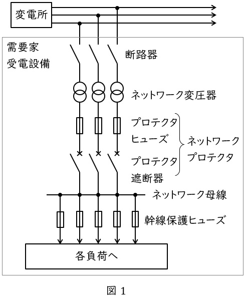 ワンポイント解説「1.スポットネットワーク配電方式」の通り,ネットワーク変圧器の二次側にはネットワークプロテクタを設けます。