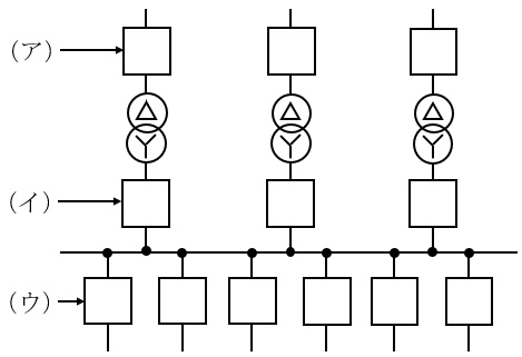 図に示すスポットネットワーク受電設備において,(ア),(イ)及び(ウ)の設備として,最も適切なものを組み合わせたのは次のうちどれか。