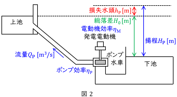 ただし,\( \ H_{0} \ \)は総落差\( \ \mathrm {[m]} \ \),\( \ h_{\mathrm {P}} \ \)は揚水時の損失水頭\( \ \mathrm {[m]} \ \),\( \ Q_{\mathrm {P}} \ \)は揚水時の流量\( \ \mathrm {[m^{3} / s]} \ \),\( \ \eta _{\mathrm {P}} \ \)はポンプ効率,\( \ \eta _{\mathrm {M}} \ \)は電動機効率,\( \ T_{\mathrm {M}} \ \)は揚水時間\( \ \mathrm {[h]} \ \)