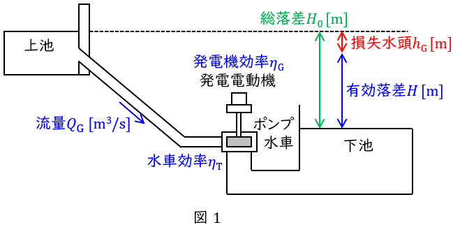 発電機出力:\( \ P_{\mathrm {G}}=9.8Q_{\mathrm {G}}H\eta _{\mathrm {T}}\eta _{\mathrm {G}} \ \mathrm {[ kW ] } \ \)