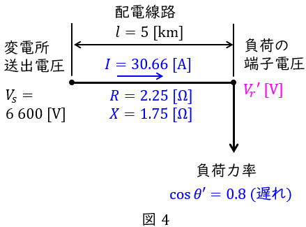 負荷の力率が\( \ \cos \theta ^{\prime }=0.8 \ \)になったときの単線図を描くと図4のようになる。負荷の\( \ \sin \theta ^{\prime } \ \)は,