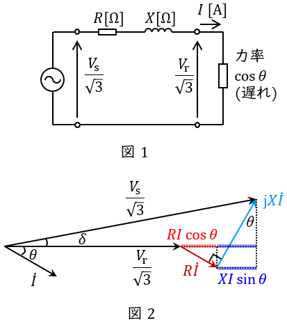 三相回路においては,一相分の等価回路及びベクトル図は図1及び図2のように描くことができ,送電端電圧と受電端電圧の位相差\( \ \delta \ \mathrm {[rad]} \ \)が無視できるぐらい小さいとしたときの電圧降下\( \ \varepsilon \ \mathrm {[V]} \ \)は,