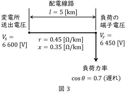 ただし, 電線\( \ 1 \ \)線当たりの抵抗は\( \ 0.45 \ \mathrm {[\Omega / km]} \ \),リアクタンスは\( \ 0.35 \ \mathrm {[\Omega / km]} \ \),線路のこう長は\( \ 5 \ \mathrm {[km]} \ \)とする。