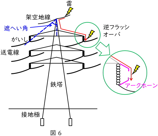 ワンポイント解説「4.架空地線」の通り,空送電線への雷撃を防止するために架空地線が設けられており,図6に示す遮へい角は小さいほど効果が雷撃防止の効果は大きくなります。