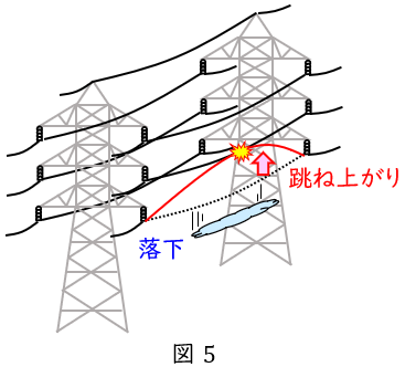 (5) 鉄塔又は架空地線に直撃雷があると,鉄塔から送電線へ逆フラッシオーバが起こることがある。埋設地線等により鉄塔の接地抵抗を小さくすることで,逆フラッシオーバの抑制が図られている。
