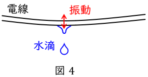 電線下面にある水滴が滴下する際,コロナ放電により電線を蹴るとその反動で揚力を生じ,電線の固有振動数と一致するとコロナ振動を生じます。