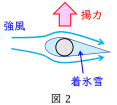 電線に非対称な氷雪が付着し肥大化すると,微風振動と同様に電線の風下側にカルマン渦が生じ振動する現象です。