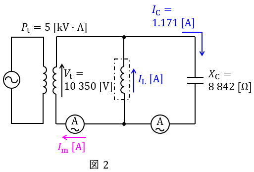 試験用変圧器の容量\( \ P_{\mathrm {t}}=5 \ \mathrm {[kV\cdot A]} \ \)とおき,ワンポイント解説「3.ケーブル試験時の等価回路」に沿って等価回路を描くと図2のようになる。