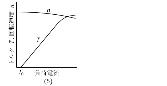 となり,電機子電流\( \ I_{\mathrm {a}} \ \mathrm {[A]} \ \)が増加するとトルク\( \ T \ \mathrm {[N\cdot m]} \ \)は比例して増加する。ただし,電機子電流\( \ I_{\mathrm {a}} \ \mathrm {[A]} \ \)が増加すると磁気飽和により,比例値より小さくなっていきます。