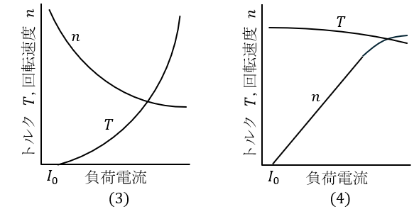 となり,電機子電流\( \ I_{\mathrm {a}} \ \mathrm {[A]} \ \)が増加すると回転速度\( \ n \ \mathrm {[{min}^{-1}]} \ \)はわずかに減少します。また,トルク\( \ T \ \mathrm {[N\cdot m]} \ \)と電機子電流\( \ I_{\mathrm {a}} \ \mathrm {[A]} \ \)の関係は,ワンポイント解説「1.直流分巻発電機及び電動機の等価回路と特性」の通り,
