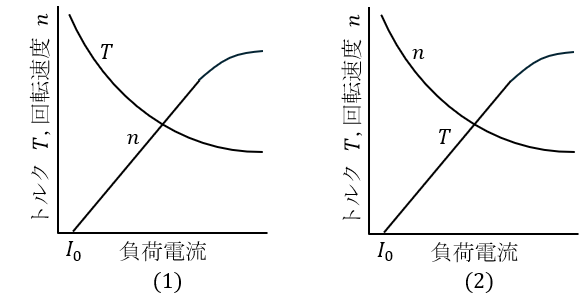 ただし,図の負荷電流は電機子電流と界磁電流の和であり,\( \ I_{0} \ \)は無負荷電流の値である。端子電圧と界磁調整器の抵抗値は一定であるとする。