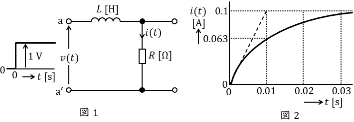 図1に示す\( \ R-L \ \)回路において,端子\( \ \mathrm {a} \ \),\( \ \mathrm {a}^{\prime } \ \)間に単位階段状のステップ電圧\( \ v\left( t\right) \ \mathrm {[V]} \ \)を加えたとき,抵抗\( \ R \ \mathrm {[\Omega ]} \ \)に流れる電流を\( \ i\left( t\right) \ \mathrm {[A]} \ \)とすると,\( \ i\left( t\right) \ \)は図2のようになった。この回路の\( \ R \ \mathrm {[\Omega ]} \ \),\( \ L \ \mathrm {[H]} \ \)の値及び入力を\( \ \mathrm {a} \ \),\( \ \mathrm {a}^{\prime } \ \)間の電圧とし,出力を\( \ R \ \mathrm {[\Omega ]} \ \)に流れる電流としたときの周波数伝達関数\( \ G\left( j\omega \right) \ \)の式として,正しいものを次の(1)~(5)のうちから一つ選べ。