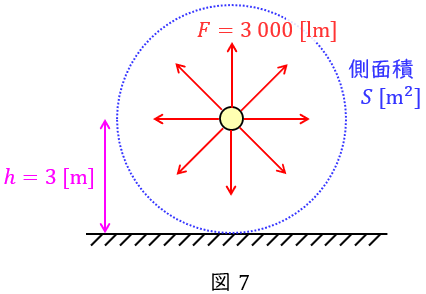図7に示すように,完全拡散性直線光源なので,床面の水平面照度\( \ E_{h} \ \mathrm {[lx]} \ \)は光源から\( \ h=3 \ \mathrm {[m]} \ \)離れた円柱の照度と考えればよい。したがって,円柱の側面積\( \ S^{\prime } \ \mathrm {[m^{2}]} \ \)は,