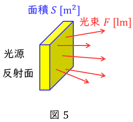 単位面積あたりの光束で単位は\( \ \mathrm {[lx]} \ \)で,図4のように光源から面積\( \ S \ \mathrm {[m^{2}]} \ \)の面に入射する光束が\( \ F \ \mathrm {[lm]} \ \)であるとき,平均照度\( \ E \ \mathrm {[lx]} \ \)は,