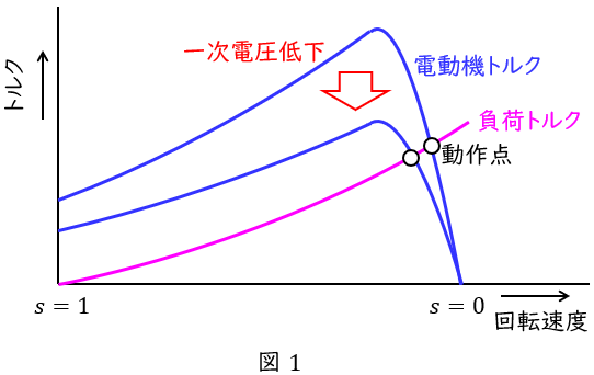 図1に示すように一次電圧を制御することでトルクの特性を変え動作点を変えるもので,滑り\( \ s \ \)を制御し,回転速度を制御できます。