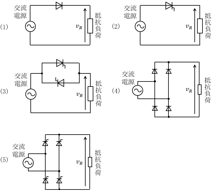 図に示す出力電圧波形\( \ v_{R} \ \)を得ることができる電力変換回路として,正しいのは次のうちどれか。