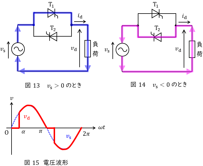 図13のように,電流は交流電源→\( \ \mathrm {T}_{1} \ \)→負荷→交流電源と流れます。出力電圧\( \ v_{\mathrm {d}} \ \)は素子の電圧降下が無視できるとすると,入力電圧\( \ v_{\mathrm {s}} \ \)と等しくなります。