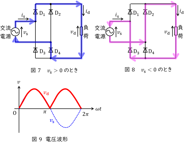 図7のように,電流は交流電源→\( \ \mathrm {D}_{1} \ \)→負荷→\( \ \mathrm {D}_{4} \ \)→交流電源と流れます。出力電圧\( \ v_{\mathrm {d}} \ \)は素子の電圧降下が無視できるとすると,入力電圧\( \ v_{\mathrm {s}} \ \)と等しくなります。