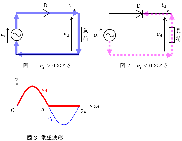 正弦波の電源電圧\( \ v_{\mathrm {s}} > 0 \ \)のときは,図1のようにダイオード\( \ \mathrm {D} \ \)が導通するため,出力側に電流が流れますが,電源電圧\( \ v_{\mathrm {s}} < 0 \ \)に切り換わると,ダイオード\( \ \mathrm {D} \ \)に対し逆方向の電圧が加わるため\( \ \mathrm {D} \ \)が導通せず,電流は流れなくなります。