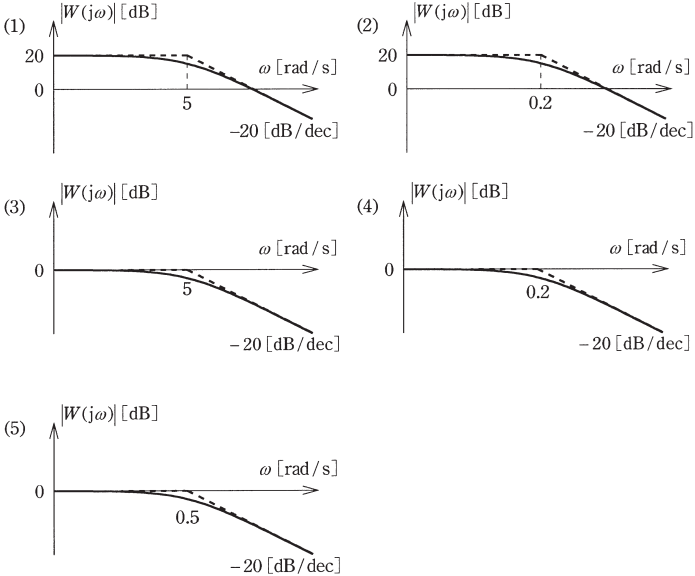 (b) 次のボード線図には,正確なゲイン特性を実線で,その折線近似ゲイン特性を破線で示し,横軸には特に折れ点角周波数の数値を示している。上記(a)の周波数伝達関数\( \ W(\mathrm {j}\omega ) \ \)のボード線図のゲイン特性として,正しいものを次の(1)~(5)のうちから一つ選べ。ただし,横軸は角周波数\( \ \omega \ \)の対数軸であり,\( \ -20 \ \mathrm{[dB/dec]} \ \)とは,\( \ \omega \ \)が10倍大きくなるに従って\( \ \left| W(j\omega ) \right| \ \)が\( \ -20 \ \mathrm{dB} \ \)変化する傾きを示している。